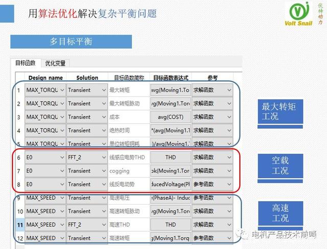 在設置目標時,我們選取了最大轉(zhuǎn)矩、空載、最高速度三個工況。其中最大轉(zhuǎn)矩工況以最大轉(zhuǎn)矩、轉(zhuǎn)矩脈動、成本、溫升時間、單位轉(zhuǎn)矩銅耗作為優(yōu)化目標,其實是即要監(jiān)控扭矩輸出能力和成本、還要監(jiān)控溫升和效率。防止出現(xiàn)高扭矩高損耗的不利情形;