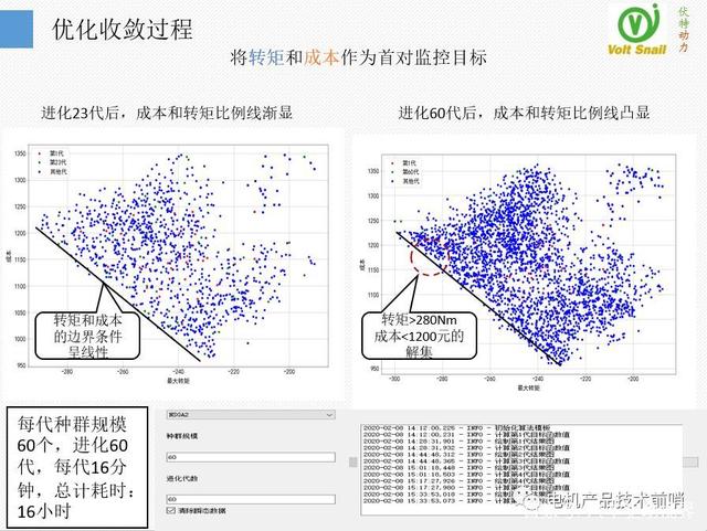 優(yōu)化的過程可以從下圖的界面中加以監(jiān)控。圖中的每一個點都代表一個方案,我們發(fā)現(xiàn)當優(yōu)化到了23代之后,轉(zhuǎn)矩和成本的邊界條件就已經(jīng)初步呈現(xiàn),這條線代表了優(yōu)化到極限時:轉(zhuǎn)矩和成本的對應的關系。進化60代后,可以看到轉(zhuǎn)矩和成本呈現(xiàn)明顯的線性關系,而成本低于1200元(原IPM電機的80%),扭矩大于280Nm的點集,就是符合我們要求的解集。