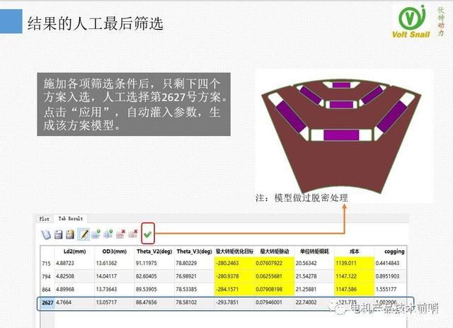 優(yōu)化完成后,能夠看到上千條解,我們施加了一系列限制條件,比如轉(zhuǎn)矩必須>280Nm,轉(zhuǎn)矩脈動必須<08%,來作多角度多方位的篩選。