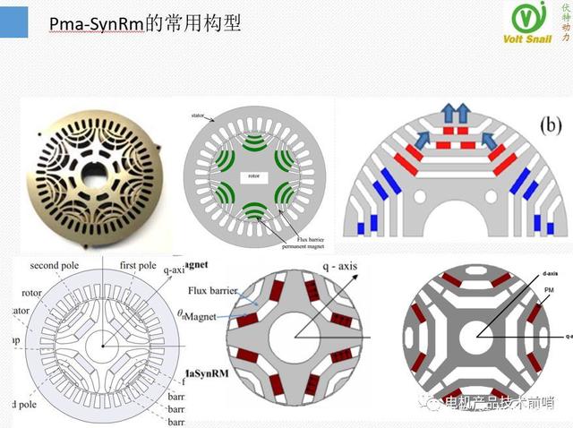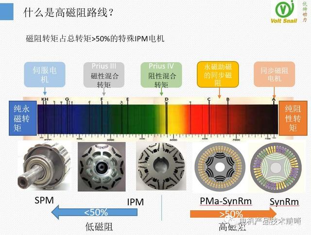 我們把視野放大,根據(jù)磁阻轉(zhuǎn)矩的比例高低制成一張“光譜”。在“光譜”的左端是“純永磁轉(zhuǎn)矩”,典型代表是“伺服應用的SPM電機”, 另一端是“純磁阻轉(zhuǎn)矩”典型代表是“ABB標準工業(yè)同步磁阻電機”。而在這兩極之間還存在許多中間狀態(tài):比如磁阻轉(zhuǎn)矩比例在50%以內(nèi)Prius第三代和第四代的IPM電機。 而高磁阻路線,追求磁阻轉(zhuǎn)矩比例超過50%,在光譜中有兩種電機可選,除了純同步磁阻電機SynRm(磁阻轉(zhuǎn)矩100%)還有一種是永磁助磁同步磁阻電機PMa-SynRm。