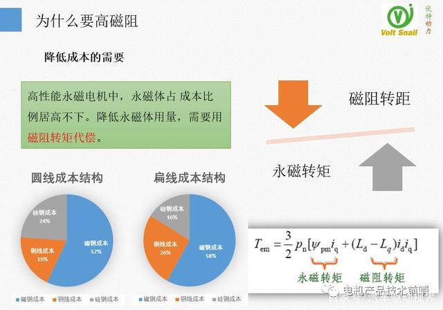 走高磁阻技術(shù)路線的最大的動因,是能夠降低成本。同樣大小的轉(zhuǎn)矩,磁阻轉(zhuǎn)矩比例提高了,永磁轉(zhuǎn)矩就減少,相應的永磁成本也降低了。如下圖所示,高性能驅(qū)動電機的有效成本構(gòu)成中,無論是圓線還是扁線,磁鋼的占比都是最高的。因此用磁阻轉(zhuǎn)矩去代償永磁轉(zhuǎn)矩是降低成本的有效措施。