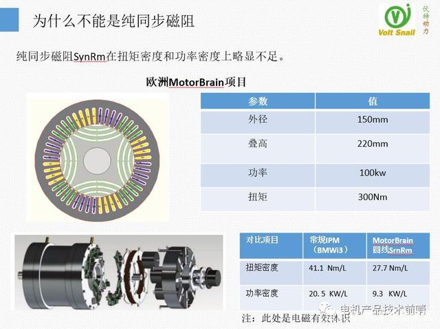 一個是歐洲聯(lián)合開發(fā)的MotorBrain項目,這是一個先進電驅(qū)動系統(tǒng)項目,其中一個方向是采用純同步磁阻電機路線。這是一個4極48槽300Nm的電機, 電機和控制高度集成。電機完成了從設計到測試的完整過程,數(shù)據(jù)表明其扭矩密度和功率密度和常規(guī)的IPM電機相比具有明顯劣勢。