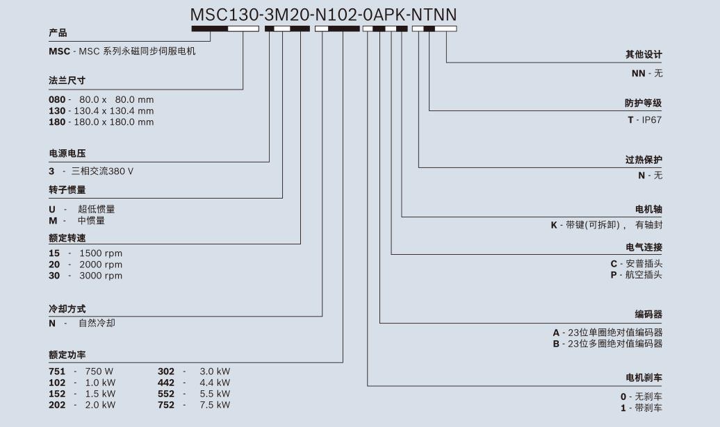 MSC 系列同步伺服電機分為3個機座號,合計8個功率段,有超低慣量、中慣量的9種電機可供選擇。最高 5000 rpm 的轉速,可滿足不同行業(yè)(例如包裝、鋰電池等)的應用需求。標配23位絕對值編碼器(單、多圈可選),適用于對控制精度有較高需求的應用場合。 F級的絕熱等級繞組、全系標配的軸封和高達 IP67 的防護等級,確保電機能夠在較為惡劣的現場環(huán)境中穩(wěn)定工作。