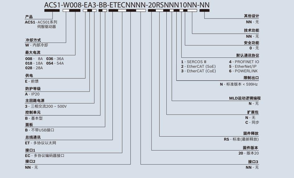 ACS01系列伺服驅動器分為5個功率段。集成的兩個RJ45網口支持SERCOS III、EtherCAT、PROFINET、EtherNet/IP和POWERLINK五種主流的基于以太網通訊的工業(yè)現場總線,可通過標配的操作面板根據實際需要進行切換。多協議編碼器接口支持多種主流編碼器,并且支持驅動第三方電機。